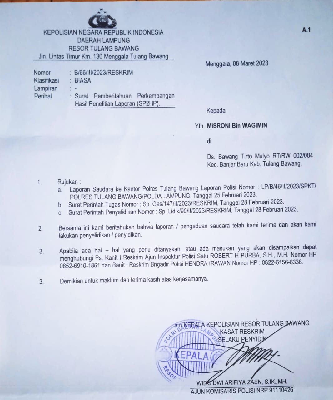 Sesuai dengan surat pemberitahuan perkembangan hasil penelitian laporan ( SP2HP) Nomot: B/66/III/2023/Reskrim Polres Tulang Bawang Polda Lampung ( 8/3/2023 ),