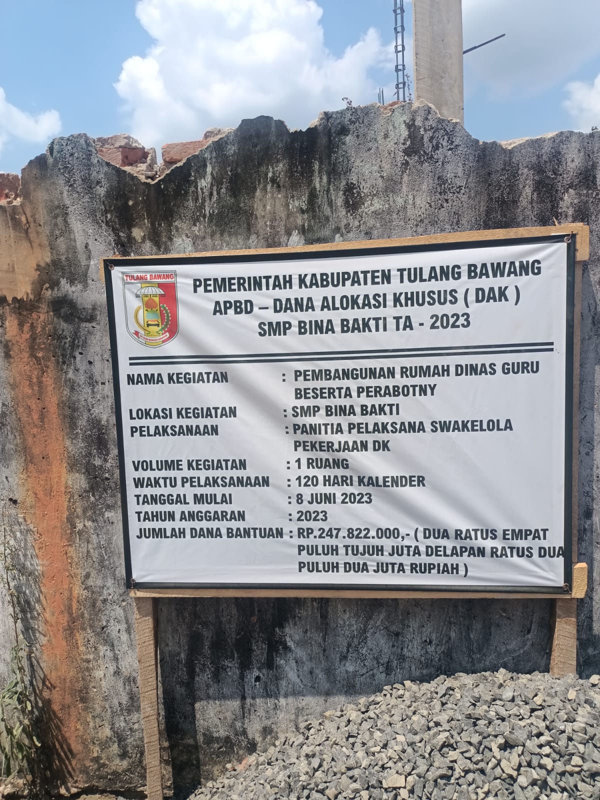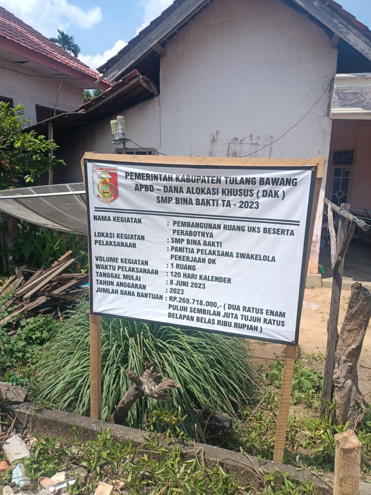 Diketahui, SMP Bina Bakti mendapatkan alokasi Pembangunan ruang Tata Usaha (TU) beserta prabotnya senilai Rp.361.937.000, pembangunan rumah dinas guru beserta prabotnya senilai Rp.247.822.000, dan pembangunan ruang Unit Kesehatan Sekolah (UKS) beserta prabotnya senilai Rp.269.718.000.