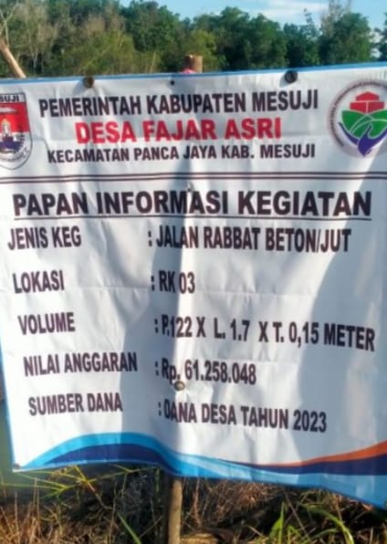 Buktiinvestigasi.com (Mesuji Lampung) – Pemerintah Desa Fajar Asri Kecamatan Panca Jaya Kabupaten Mesuji Lampung, membangun Jalan Usaha Tani(JUT) melalui Dana Desa (DD) Tahun 2023 sudah terealisasikan