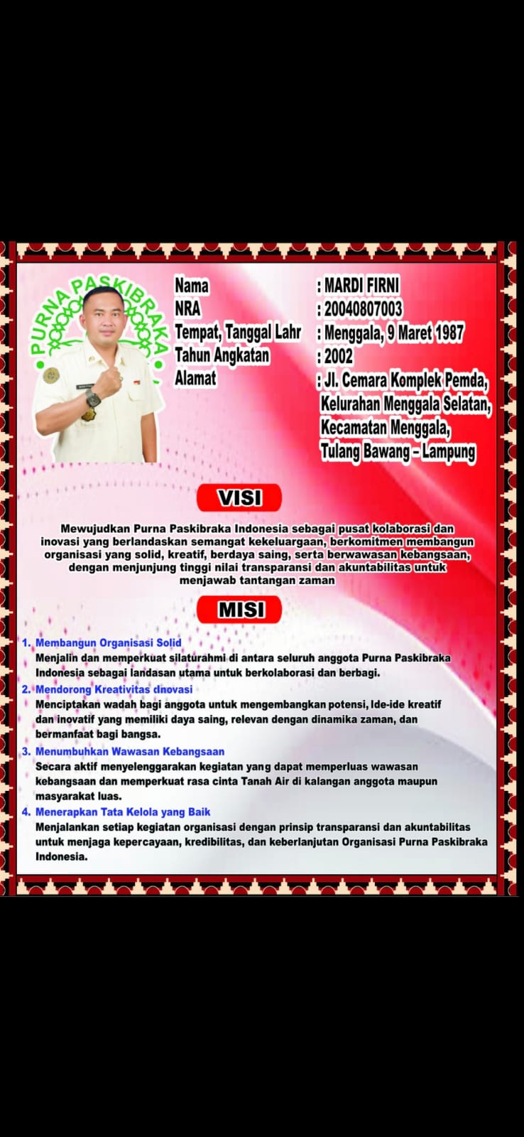 Buktiinvestigasi.com (Tulang Bawang -Lampung) – Mardi Firni kembali Pimpin Tampuk Kepemimpinan organisasi Purna Paskibraka Indonesia (PPI) Kabupaten Tulangbawang hingga tiga tahun ke depan. Keputusan itu berdasarkan hasil musyawarah kabupaten ke-V yang di laksanakan di aula Islamik Center Menggala, Minggu, 28 September 2025.