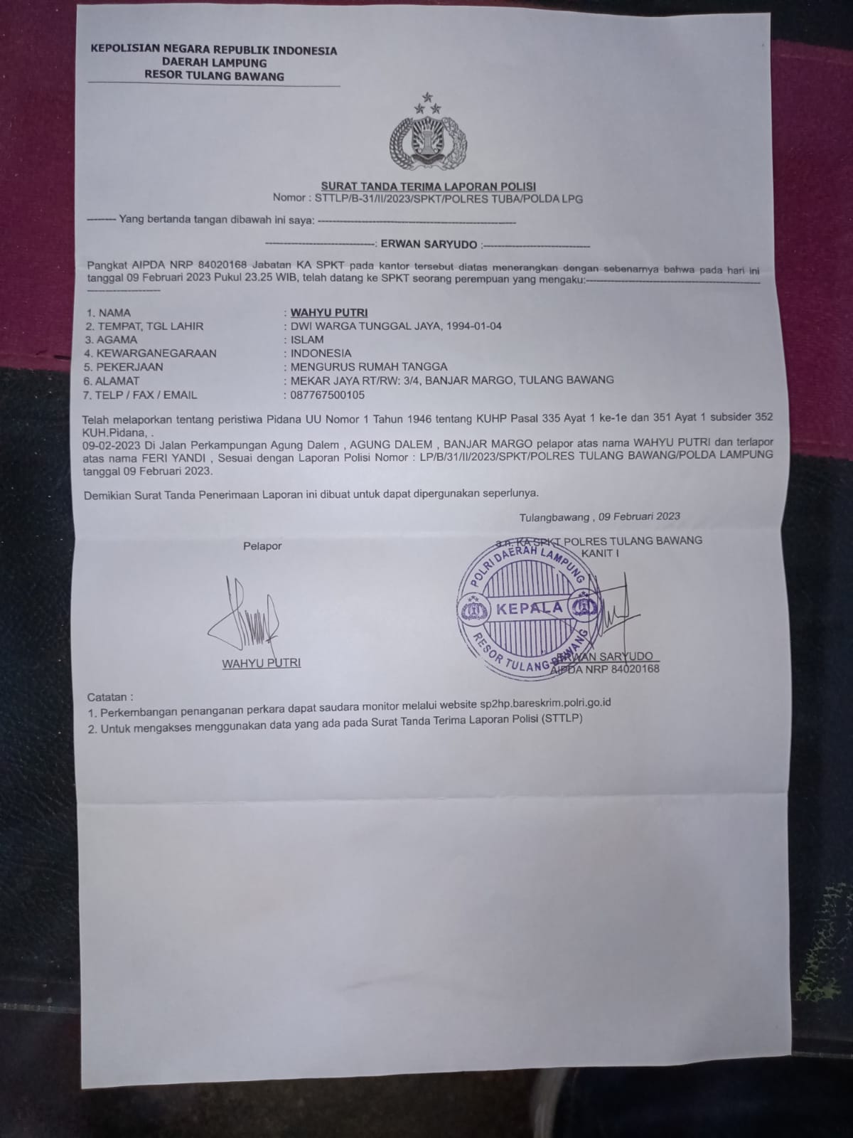 WP menujukan surat tanda terima laporan polisi ( STTLP ) dengan nomor STTLP /B -31/2023/SPKT /Polres Tulang Bawang/ Polda Lampung terkait pristiwa pidana UU nomor 1 tahun 1946 tentang KUHP pasal 335 ( kekerasan ) ayat 1 ke -1e dan 351 ayat 1 subsider 352 KUH pidana yang di terima oleh KSPK 1 AIPDA Erwan Saryudo kepada wartawan di kediamannya dikampung Dwi warga Tungal Jaya unit II kecamatan Banjar agung Tulang Bawang sabtu ( 11/2/2023 ) sekira pukul 15,30 WIB.