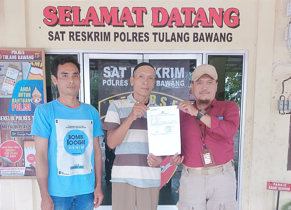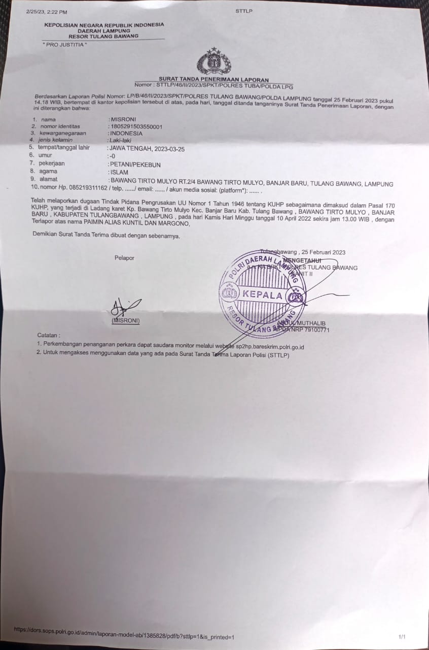 Misroni bersama pendamping hukumnya Junaedi,S.H,melapor ke Satreskrim Polres Tulang Bawang Polda Lampung karena merasa menjadi korban tindak pidana pengerusakan, sesuai dengan surat tanda penerimaan Laporan ( STPL ) polisi, Nomor : STTLP/46/II/2023/SPKT/PolresTuba/Polda LPG.tangal 25 Februari 2023 pukul 14,18 WIB